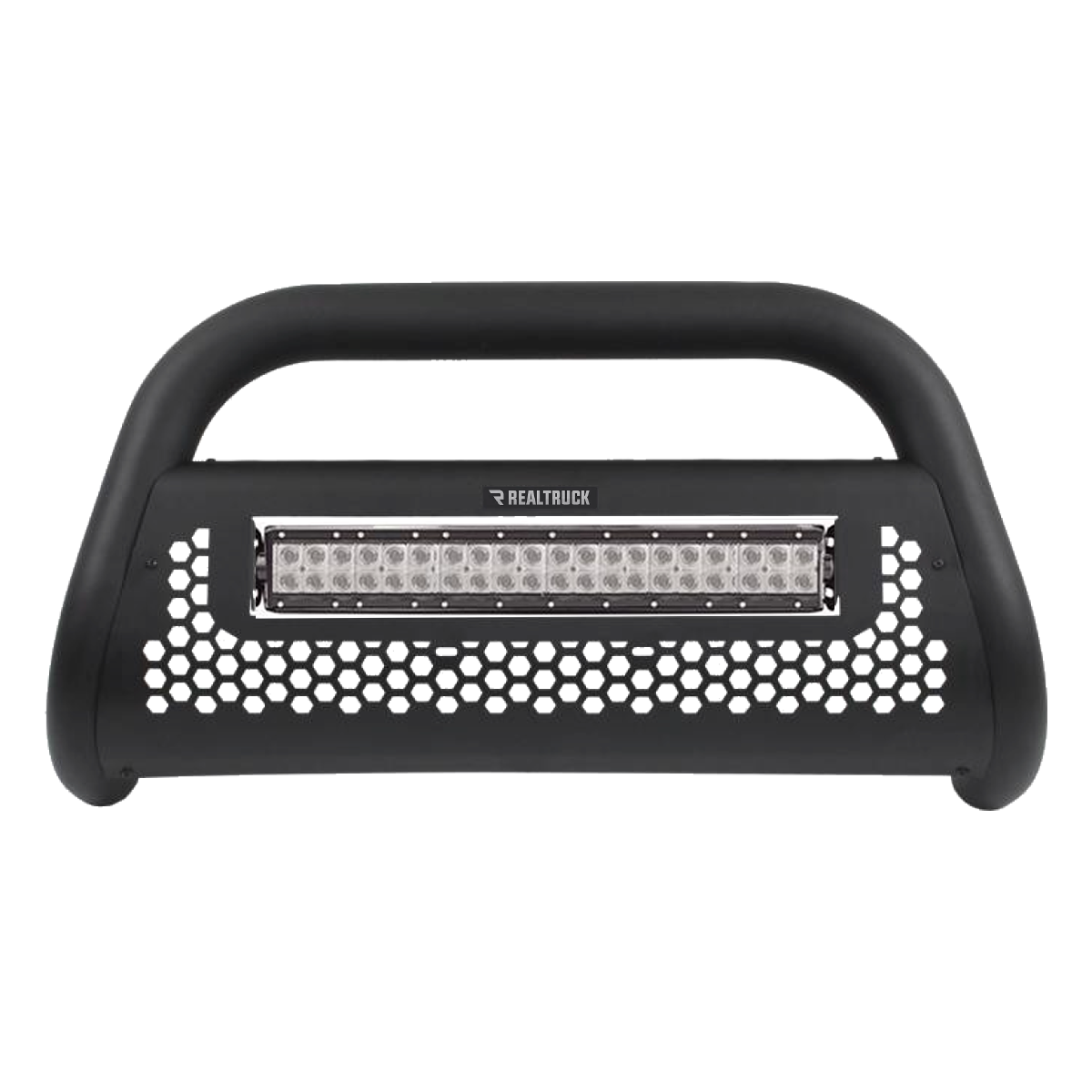 La serie RC2 LR de GO RHINO ofrece estilo con un diseño innovador y faros auxiliares integrados. El acabado texturizado en pintura negra electrostática y el emblemático patrón hexagonal de la parrilla realzan el estilo del vehículo.