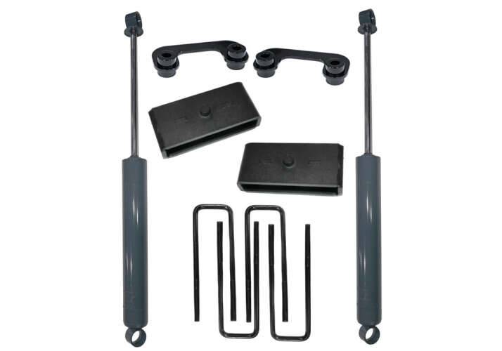 Este kit de Silverado o Sierra de 2" proporciona un kit de elevación moderada para la suspensión delantera, un kit de bloque trasero y U-bolt más amortiguadores traseros. Con un precio mucho menor que los elevadores tradicionales más altos, esta es la solución simple para aquellos que desean una forma económica y fácil de hacer espacio para neumáticos más altos para la distancia al suelo o un paquete de neumáticos y ruedas de tamaño grande en el vehículo.