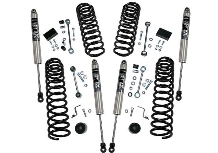 Para complementar estos nuevos resortes helicoidales JLU de doble velocidad, el kit también incluye soportes de extensión de amortiguador o amortiguadores Fox, espaciadores de parada de compresión y enlaces de barra estabilizadora extendidos. Los amortiguadores Fox o soportes de amortiguador permiten la máxima cantidad de recorrido de extensión sin atascar el eje de transmisión y los espaciadores de parada de compresión evitan el roce de los neumáticos durante la compresión completa.