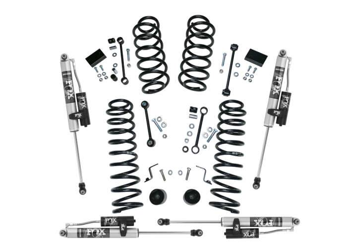 Para complementar estos nuevos resortes helicoidales JLU de doble velocidad, el kit también incluye soportes de extensión de amortiguador o amortiguadores Fox, espaciadores de parada de compresión y enlaces de barra estabilizadora extendidos. Los amortiguadores Fox o soportes de amortiguador permiten la máxima cantidad de recorrido de extensión sin atascar el eje de transmisión y los espaciadores de parada de compresión evitan el roce de los neumáticos durante la compresión completa.