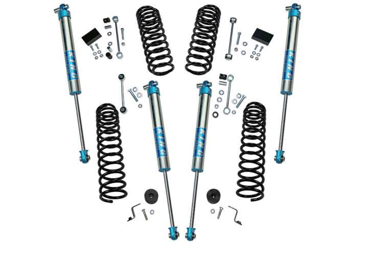 Para complementar estos nuevos resortes helicoidales JLU de doble velocidad, el kit también incluye soportes de extensión de amortiguador o amortiguadores Fox, espaciadores de parada de compresión y enlaces de barra estabilizadora extendidos. Los amortiguadores Fox o soportes de amortiguador permiten la máxima cantidad de recorrido de extensión sin atascar el eje de transmisión y los espaciadores de parada de compresión evitan el roce de los neumáticos durante la compresión completa.